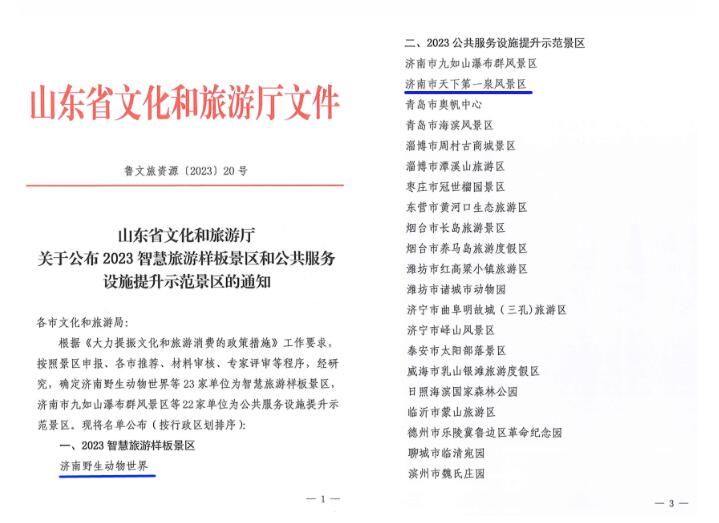 近日,山东省文化和旅游厅公布了“2023智慧旅游样板景区和公共服务设施提升示范景区名单”,其中,集团权属单位济南野生动物世界获评2023智慧旅游样板景区,天下第一泉风景区获评2023公共服务设施提升示范景区。