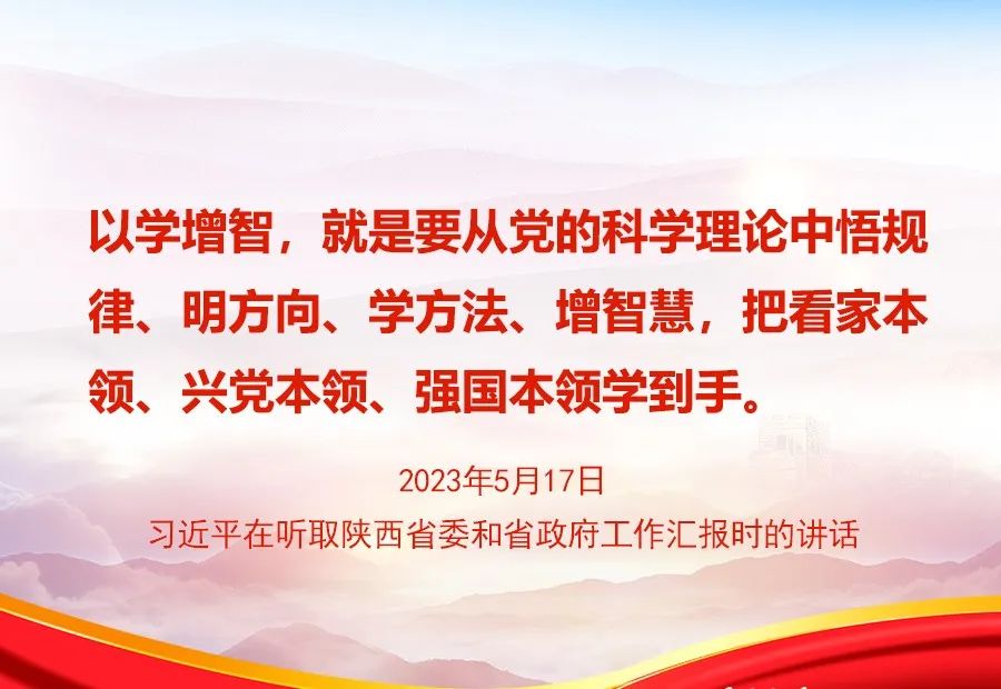 2023年5月17日,习近平总书记在听取陕西省委和省政府工作汇报时指出,学习贯彻新时代中国特色社会主义思想主题教育正在全党深入开展,各级党组织务必在深入、扎实上下功夫,在以学铸魂、以学增智、以学正风、以学促干上见实效。